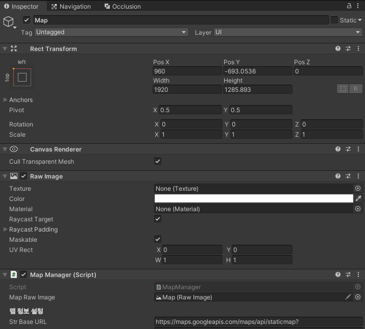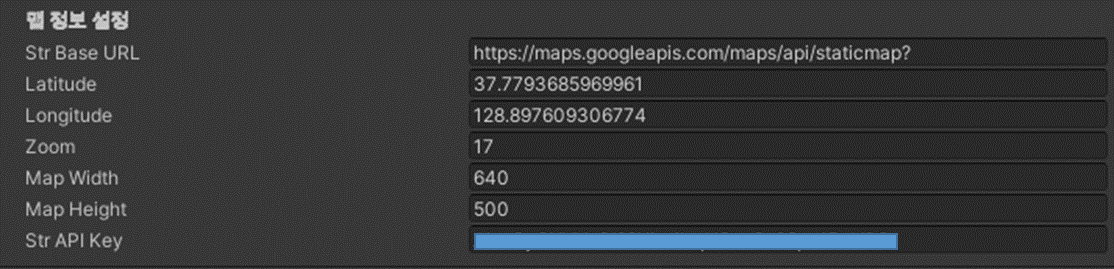 인스펙터 창에서 자신이 보여줄 맵의 위도와 경도를 설정하고 StrApiKey 에 자신의 키값을 넣으면 된다.